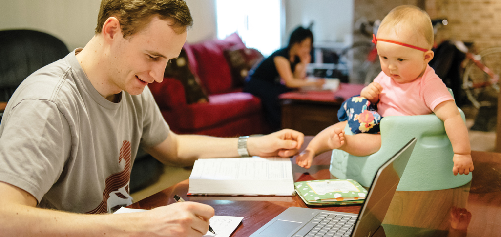 The morning is a struggle for electrical engineering student Nick Elliott, who is operating on no sleep after pulling an all-nighter to study and finish homework that is now due. He rushes to head toward his two classes in differential equations and circuits, but on the way, he makes a stop at the Alfred Emery Building. There, in the “purple room” of the ASUU Student Child Care Center, he pauses for a moment with his 7-month-old daughter. “I try to set her down and get her used to sitting by herself so she doesn’t freak out when I leave,” he says. In about three hours, after his classes wrap up, Elliott picks her up from the center and tends her for the day while his wife, Alla, who is also a student at the University of Utah, attends her classes and works as an accounting clerk. He says there’s an art to balancing his schooling with responsibilities as a dad and work at Costco, where he spends three nights a week and a full shift on Saturday.